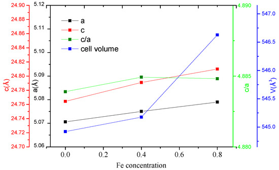 The structure of SmNi can be described by an alternating stacking of hexagonal blocks of SmNi type and cubic blocks of SmNi type along the hexagonal axis. For the same composition, two structure types are possible: the hexagonal structure (H) of space group or the rhombohedral structure (R) of space group . In the rhombohedral structure of SmNiFe, Sm atoms occupy two crystallographic sites, and , while Ni atoms occupy three non-equivalent sites: , , and . Therefore, the iron atoms were placed to share the different Ni sites: , , and . Figure 1 shows the Rietveld refinement pattern of SmNi compound XRD. The Rietveld refinement of the diffractograms obtained by X-ray diffraction for SmNiFe (x = 0, 0.4, and 0.8) shows that the cell parameters a and c increase when the concentration of iron increases. Consequently, the cell volume increases Figure 2, and, obviously, the interatomic distances increase; the increase of the interatomic distances has a significant effect on the value of the Curie temperature; this effect will be discussed in the magnetic results.