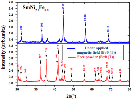The SmNiFe compounds have a significant uniaxial magnetocrystalline anisotropy; it results from the anisotropies provided by Sm. Figure 3 shows the comparison between X-ray diffractograms of free and oriented powder measured at 300 K on SmNiFe (x = 0, 0.8). The XRD obtained on oriented powders shows some reticular planes disappearance and the reinforcement of indexed Bragg peaks compared to the diagram measured on free powder; thus, the axis of easy magnetization at room temperature is the c-axis. This anisotropy is clearly shown by strengthening the Bragg peaks of type .