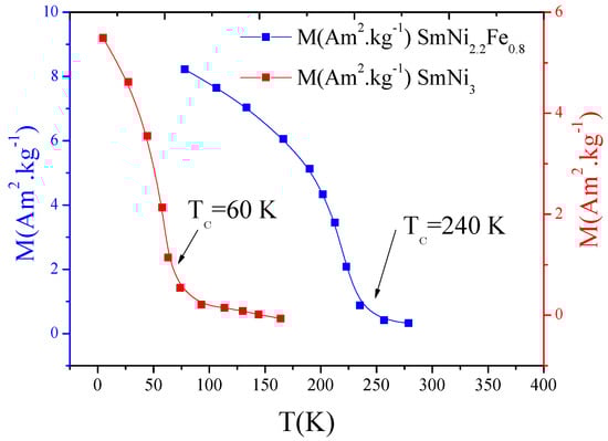 Intermetallic compounds present very interesting structural and magnetic properties. As a result, they have been used in many different technological applications [1]. Intermetallic compounds are intensively studied; they are studied for hydrogen absorption [2,3], for their thermomagnetic properties [4,5], for their magnetocaloric effect [6,7,8,9,10,11,12,13,14,15,16,17,17], and for their critical behavior around ferromagnetic to paramagnetic phase transition [18,19]. The SmNi compound is a compound with very interesting structural and magnetic properties. This is due to the fact that the atomic environments of the Sm and Ni atoms are very different and not equivalent [20]. In RNi intermetallics, the different exchange interactions do not have the same importance in determining the Curie temperature. We can consider that the Curie temperature’s only contribution is the exchange interaction between the magnetic moments of the – sublattice. A low Curie temperature characterizes the SmNi compound. This is mainly due to the low magnetic moment of the Ni atom and short Ni–Ni interatomic distances between the atoms at the – and – sites that lead to negative Ni–Ni interactions. Entropy is a measure of order in the magnetocaloric system. The magnetic entropy variation is evaluated by the magnetic measurement method, and this method is directly related to the magnetization isotherms as a function of the applied magnetic field for different temperatures. It is possible to obtain the value of , at different fields and temperatures, after numerical integration of Maxwell’s relation [21]. The magnetocaloric effect (MCE) in various magnetic materials has been extensively investigated experimentally and also theoretically, not only because of their potential applications for active magnetic refrigeration but also for understanding the fundamental properties of these materials. The experimental study of the magnetocaloric effect requires the measurement of the magnetization as a function of the magnetic field for several temperatures around the magnetic transition while respecting the adiabatic condition of the magnetic field variation, so this measurement is very time-consuming and energetically costly. In this work, we have determined, theoretically and experimentally, the magnetic and magnetocaloric properties of two intermetallic compounds, SmNi and SmNiFe, for several magnetic field values. For the theoretical method, one measure of magnetization at low magnetic field is necessary to calculate the magnetic entropy change for a given magnetic field variation. Finally, a comparison is made between the two methods.