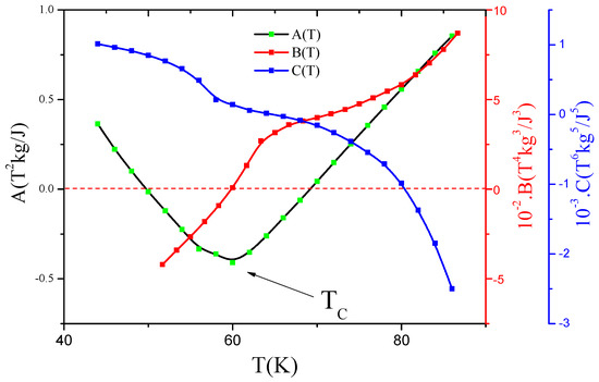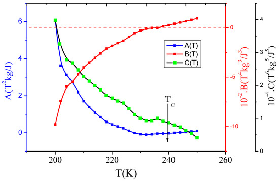 The coefficients , and are the Landau parameters determined by fitting as a function of the magnetization M with equilibrium condition equation. and are always positive (Figure 7 and Figure 8). From , we can determine the value that corresponds to its minimum. However, can be positive, zero, or negative; the sign of can indicate if the magnetic transition is first-order phase transition or second-order one. Indeed, if , the magnetic transition is a second-order transition phase; otherwise, the magnetic transition is a first-order transition phase. (Figure 7 and Figure 8) show Landau coefficient plotted against temperature. For SmNiFe (x = 0.8), , which confirms that the magnetic transition is a second-order type.