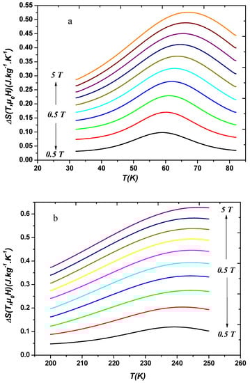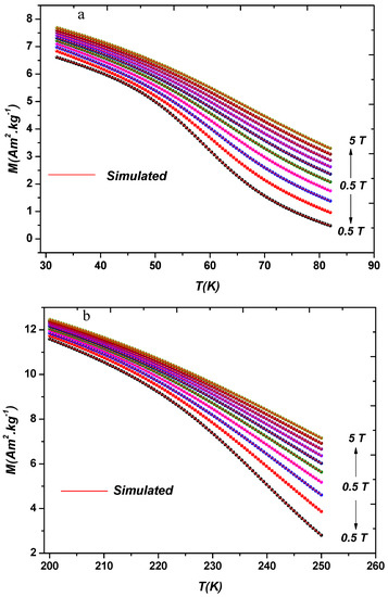 XRD diagrams are analyzed with the Rietveld method [26,27] using the Fullprof program [28,29]. A Physical Properties Measurement System (PPMS) magnetometer was used for measurements at low temperatures. Isotherms were collected at an interval of 2 K around with an applied magnetic field up to 5 T. To obtain the internal field , the external applied magnetic field was corrected for the demagnetization effect using . Demagnetization constant was determined from M vs. curve in low field region following the method given in Reference [30].