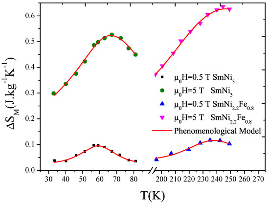 Figure 9 shows a good agreement between modeled and experimental magnetization variation with temperature for SmNi and SmNiFe. Symbols represent experimental data, and the red line corresponds to modeled magnetization.