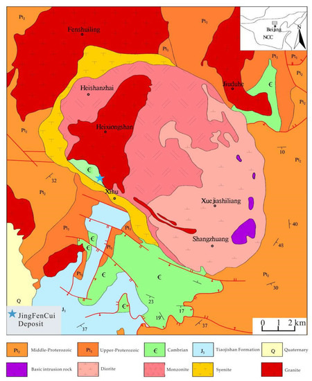 The JingFenCui deposit is located in Changping district, Beijing. With a paragenetic Mn-rich garnet, it is a typical manganese skarn deposit found in the contact zone between Yanshanian granitic fine-grained rock and Cambrian manganese-bearing limestone [3]. The JingFenCui rhodonite deposit is located in the southeast of the Jundushan magmatic belt in the western part of the Yanshan platform fold belt of the North China platform. Folds and faults are developed, magmatic activity is strong, and geological conditions are complex. The Mesozoic intrusive rocks in the deposit are characterized by multistage activities, and the exposed rocks are mainly Heixiongshan granite, Heishanzhai monzonite, Humen (Xihu) syenite, and Xuejiashiliang and Shangzhuang diorite [4,5] (Figure 1).