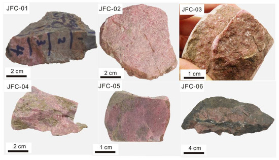 A representative sample of the contact zone between rhodonite jade ore and the wallrock was selected (JFC-01), as well as some rhodonite ore and galena-bearing rhodonite ore. All samples were from the Changping district of Beijing, China and labeled as JFC-01 to JFC-06. In total, six samples were selected to observe the regular gemological characteristics, i.e., color, refractive index, transparency, luster, and texture (Figure 2).