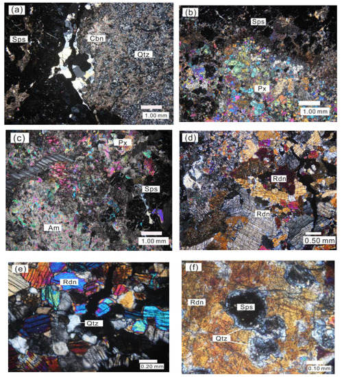 Characteristics of JingFenCui under polarizing microscope (crossed-polarized light): (a) carbonate (Cbn), quartz (Qtz), and spessartine (Sps); (b) spessartine and pyroxene (Px) at the junction of Zone B and Zone C; (c) amphibole (Am) of fiber-columnar and sheet structure in Zone C; (d) parallel and near-rectangular cleavage of rhodonite; (e) inclusions of quartz, carbonates, and spessartine are present in rhodonite (Rdn); (f) quartz-rimmed spessartine encased in rhodonite.