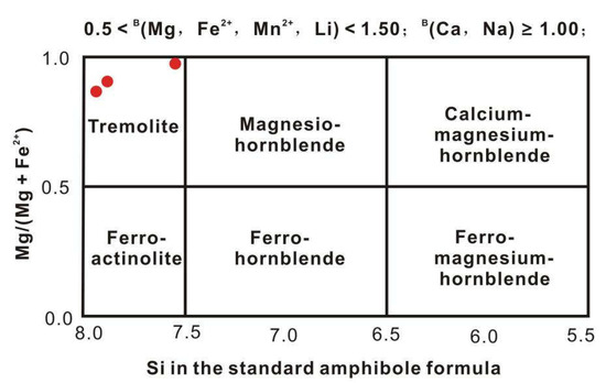 According to the occupancy of the B sites as calculated arithmetically [13,14,15,16], when 0.50 < B (Mg2+ + Fe2+ + Mn2+ + Li+) < 1.50 and 0.50 ≤ B (Ca + Na) ≤ 1.50 a.p.f.u., the amphibole is a member of the sodium-calcium-magnesium-iron-manganese-lithium group. Among the amphibole minerals in this experiment, the T sites are mainly occupied by Si (>7.00). The B sites are occupied mainly by Mn, Ca, and a small amount of Na. In C sites, few Mn and Fe replace Mg, Mg/(Mg + Fe2+) ≥ 0.5. When BCa > 1 > BMn > 0.5, the amphibole belongs to manganotremolite (Figure 6), and when BMn > 1 > BCa > 0.5, it belongs to clino-suenoite (Figure 7).