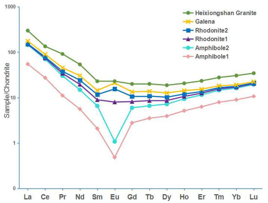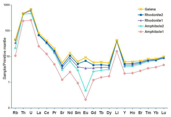 In order to understand the similarities and differences of the trace-element concentrations in minerals, the trace-element and rare-earth-element concentrations in rhodonite and adjacent amphibole and galena were tested (listed in Table 2). Primitive mantle-normalized trace-element diagrams and chondrite-normalized REE patterns are shown in Figure 8 and Figure 9, respectively. Normalizing values are after Sun and McDonough (1989) and Boynton (1984) [17,18].