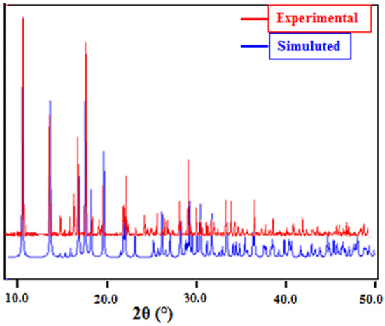 The coincidence between the peak positions of the experimental and the simulated powder X-ray diffraction patterns (PXRD), indicated in Figure 1, verify the phase purity of the compound (C5H14N2)[HgCl4]·H2O.
