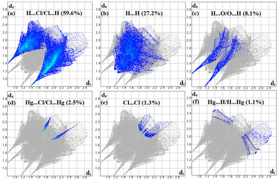 Relative contributions of various intermolecular interactions to the Hirshfeld surface area of (C5H14N2)[HgCl4]·H2O: (a) H…Cl/Cl…H contacts; (b) H…H contacts; (c) H…O/O…H contacts; (d) Hg…Cl/Cl…Hg contacts; (e) Cl…Cl contacts; (f) Hg…H/H…Hg contacts.