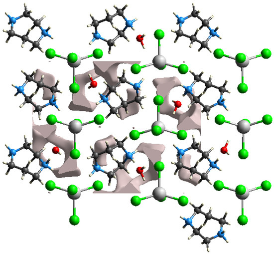 The value 59.6% is attributed to the dominant contacts, which are H…Cl/Cl…H, corresponding to the interactions C–H…Cl, N–H…Cl, and O–H…Cl (Figure 7a). They are illustrated by a pair of sharp spikes characteristics in the 2D fingerprint plot. Furthermore, because of the abundance of chlorine and hydrogen on the molecular surface, these connections are the most common contacts: in this case, the SCl is 32.35%, and the SH is 61.6%, with an enrichment rate larger than the unity EHCl = 1.495 (Table 2). The H…H contacts occupy 27.2% of the total surface, due to the abundance of hydrogen at the molecular surface with EHH= 0.719. The H…H contacts are illustrated by a large spot located in the middle of the 2D fingerprint (Figure 7b). The percentage 8.1% is reserved for the third interactions in the (C5H14N2)[HgCl4]·H2O, which are H…O/O…H contacts with an enrichment rate greater than the unit EHO= 1.623 (Figure 7c). They refer to N–H…O hydrogen bonds type. Hg…Cl/Cl…Hg contacts contribute 2.5% of the total surface (Figure 7d). The percentages 1.3% and 1.1% are assigned, respectively, to the Cl…Cl contacts and to the Hg…H/H…Hg interactions (Figure 7e,f). Additionally, Figure 8 illustrates the produced crystal’s void region. The voids in the crystalline substance were observed by generating an isosurface of the electron density (0.002 a.u.). The volume of the empty surface per unit cell is about 72.91 Å3, and its surface area is 295.82 Å2. The crystal unit lattice has a void percentage around 5.844%.