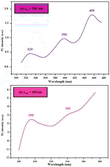 The excitation and emission spectra of (C5H14N2)[HgCl4]·H2O are shown in Figure 10 at ambient temperature and in the solid state. The excitation spectrum is recorded for a wavelength of the order of 280 nm, and three bands are observed, of which the most intense is detected around 455 nm. The emission spectrum is constituted by two bands; the first band is observed at 295 nm, and the second band is detected at 341 nm (the most intense). These two bands may mainly arise from ligand-metal charge transfer (LMCT) [53,54].