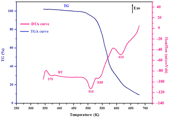 Figure 11 highlights the results obtained by the thermal analysis of the compound (C5H14N2)[HgCl4]·H2O. According to the TGA-DTA curve, four peaks were detected in the DTA curve, and three mass losses in the TGA curve. The first peak at 370 K corresponds to the elimination of the water molecule, with a loss of mass of 3.605% (experimentally) vs. 3.8% (theoretically). The second and the third peaks are observed at 510 (ΔH= 415.279 J·g−1) and at 539 K, and they correspond to the departure of the organic part (C5H14N2)2+and four chlorine atoms, with a mass loss theoretically equal to 52.739% and experimentally to 53%. The fourth peak, located at 615 K (ΔH = 495.741 J·g−1), corresponds to the Hg atom’s escape, with a mass loss of 43% (experimentally)/43.3% (theoretically). The black residue (10%) obtained at the end of the analysis is formed by a mixture of mercury oxide and carbon.