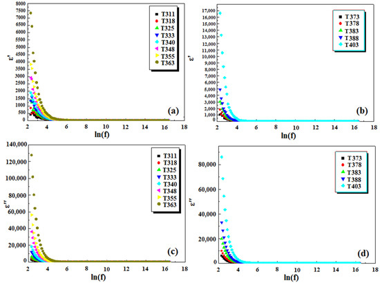 (a,b) ε′ as a function of ln(f); (c,d) ε″ as function of ln(f).