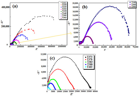(a)-–Z″ versus Z′ of (C5H14N2)[HgCl4]·H2O at the range of 311–363 K; (b) Illustrative representation of –Z″ versus Z′ of (C5H14N2)[HgCl4]·H2O at 363, 355 and 348 K; (c)—Z″ versus Z′ of (C5H14N2)[HgCl4]·H2O at the range of 373–403 K.