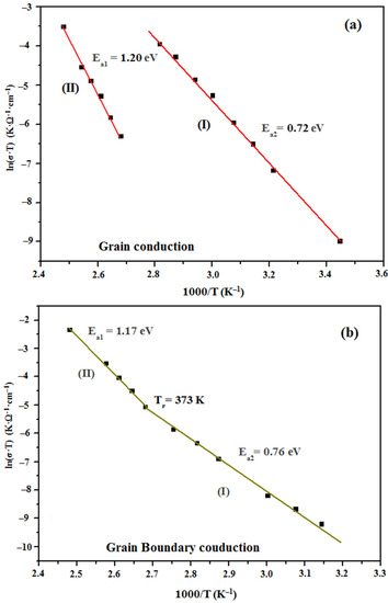 Based on the Arrhenius modeling equation, Figure 15 depicts the development of electrical conductivity (grain and grain boundary) as a function of temperature: σ·T = A exp(−Ea/Kβ·T) [66] (where Ea represents the activation energy, A is the pre-exponential factor, K is the Boltzmann constant, and T is the temperature in Kelvin). The curves of Figure 15a,b show a breakout towards 373 K. Indeed, the curves are made up of two parts, (I) and (II). The first part (I) is located in the region of temperatures below 363 K, while the second part (II) is placed in the region of temperatures above 373 K. The conductivity follows Arrhenius’ law in both parts. According to the curves in Figure 15, there isa modification in the slope of the linear curve at T = 373 K. The change in the slope can be explained by a modification of the conduction mechanisms, which causes the departure of the water molecule (dehydration) because our compound contains H2O. This phenomenon is observed in other materials [67]. We think that the conduction is of proton origin. Protons of the synthesized material come from the organic part and from the water molecules. After dehydration, conducting proton density decreases, inducting the sudden decrease of the conductivity observed at 373 K. This result was confirmed in the TGA-DTA part. The activation energies deduced for both conductions are very close: Ea1 = 1.20 eV and Ea2 = 0.72 eV (grain conduction), and Ea1 = 1.17 eV and Ea2 = 0.76 eV (grain boundary conduction).