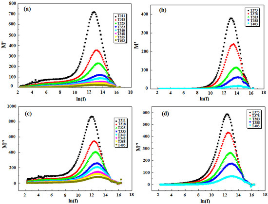 The fluctuation of the real component M′ of the electrical modulus M′ is seen in Figure 16a,b. The low values of M′ are reported at all temperatures and in the low-frequency zone. When the frequency is raised, the value of M′ grows as well, until it hits a maximum, indicating a maximum in dielectric losses. Such findings might be linked to a lack of restoring force guiding charge carrier motion under the influence of generated electric fields. This demonstrates that the electrode effect in the material has been eliminated [68]. In Figure 16c,d, at various temperatures and frequencies, the fluctuation of the imaginary part of the electrical modulus M″ is shown as a function of ln(f), implying a connection between the movements of the mobile ions [69]. At temperatures between 311 and 403 K, a well-recognized relaxation process has been established. As the temperature rises, the relaxation peaks move to higher frequencies. The modulus spectrum’s appearance shows that the material has a hopping electrical conduction process.