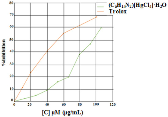 Inhibition (%) as a function of concentrations of (C5H14N2)[HgCl4]·H2O and of Trolox.