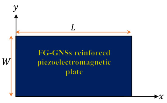 In this paper, we consider multi-layered piezoelectromagnetic plates reinforced with functionally graded graphene platelets with rectangular platform in which the length, width and total thickness are indicated by L, W and h, respectively, as displayed in Figure 1. The Cartesian coordinates system is used to prescribe the infinitesimal deformations of the plate. This plate is assumed to be resting on a Winkler–Pasternak elastic substrate with stiffness , and subjected to an external electric voltage and magnetic potential.