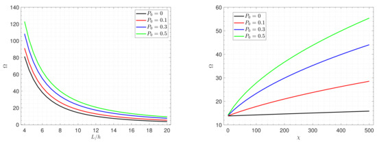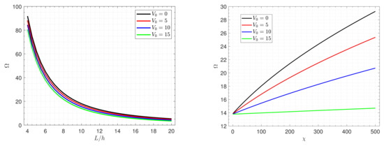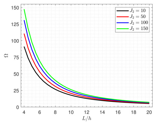 For more explanation of the effects of the piezoelectromagnetic multiple on the fundamental frequency , Figure 9 displays the frequency against the side-to-thickness ratio for various values of the parameter . It is notable that with the increase in the piezoelectromagnetic properties of graphene, the plate becomes stiffer, leading to an increment in the frequency.