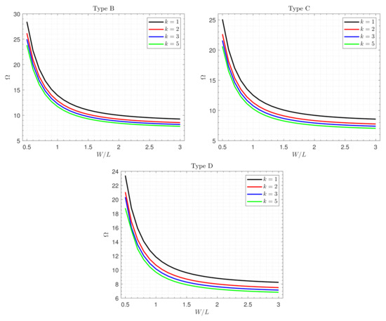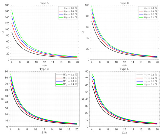 Effects of the graphene weight fraction on the fundamental frequency of different types of the nanocomposite piezoelectromagnetic plate resting on an elastic foundation are revealed in Figure 5. It is evident from this figure that, regardless of the plate type, the frequency monotonically decreases as the ratio increases, because the plate becomes weaker with an increasing side-to-thickness ratio. Moreover, since the more flexible plate yields smaller frequencies, the decrease in the graphene components reduces the fundamental frequency . The frequency of the types A, B, C and D can be arranged as: Type A > Type B > Type C > Type D. This means that the plate reinforced with uniformly distributed GNSs is stiffer than that reinforced with FG-GNSs. In addition, the influence of is more pronounced in the case of Type A.