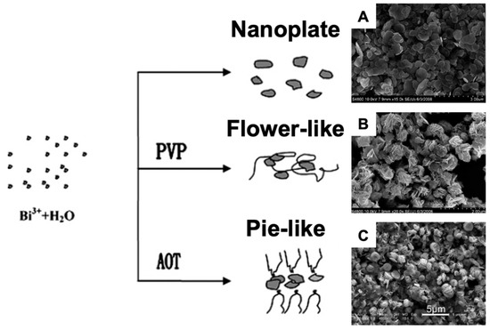 As is well known, there is a close relationship between the morphology of nanostructure photocatalysts and their dye degrading activity. BiOCl NMs with various morphologies, including nanoplate, nanosheet, nanobelt, nanotube, microspheres, and microflowers, were fabricated to improve their photocatalytic efficacy. As a widely used surfactant, polyvinylpyrrolidone (PVP), was used for fabricating BiOCl NMs with different nanostructures [35]. Zhang et al. have used different surfactants as assembly reagents to investigate the influence of morphology as well as the photocatalytic activity. As shown in scanning electron microscope (SEM) images (Figure 1), without a surfactant, the main morphology is 2D nanoplates with an average size of 40 nm in thickness, while the 2D nanoplates could be self-assembled into uniform flower-like (Figure 1) and round pie-like (Figure 1) architectures when added to a PVP and bis(2-ethylhexyl) sulfosuccinate (AOT)/isooctane solution. They also proposed a possible growth mechanism. As shown in Figure 1, numerous tiny BiOCl crystalline nuclei appear first. Then, these tiny nuclei could grow into 2D nanoplates based on their inner crystallographic orientation. When adding PVP as the assemble reagent, these nanoplates could easily aggregate on these long chain polymers and form a 3D complex hierarchical structure. However, when using AOT as the surfactant, these nanoplates tend to constitute the final products of square plates due to the two hydrophobic chains of AOT. The building blocks of the flower-like BiOCl were cross-link nanoplates, while the pie-like were flat microplates. Compared with nanoplates, the flower-like BiOCl could effectively degrade different dyes, such as MO, rhodemine B (RhB), methene blue (MB), and ethylene violet (EV), with the irradiation of simulated sunlight due to its larger specific surface area [36].