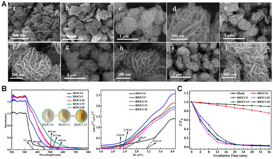 SEM images (A), UV-vis DRS (B), and photocatalytic dye degradation ability (C) of BiOCl NMs synthesized with different amounts of thiourea. For SEM images, BiOCl-0 (a,b), BiOCl-5 (c,d), BiOCl-10 (e,f), BiOCl-15 (g,h), BiOCl-30 (i,j). Reproduced with permission from Ref. [38], 2019, American Chemical Society.