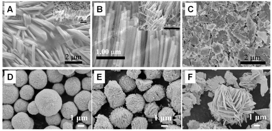 (A–C) SEM images of BiOCl flake (A) and nanowire arrays (B) on AAO template (A), flake-like film on glass template (C); reproduced with permission from Ref. [45], 2010 and 2011, Elsevier (Amsterdam, Netherlands); (D–F) SEM images of BiOCl nanoneedle- and nanosheet-assembled microspheres. Reproduced with permission from Ref. [46], 2020, Elsevier.
