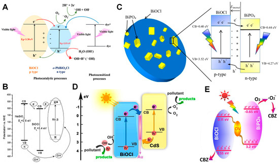 Scheme of various BiOCl-based heterostructures. (A) BiOCl-PbBiO2Cl type I heterostructure. Reproduced with permission from Ref. [57], 2018, Elsevier. (B) BiOCl-NaBiO3 type II heterostructure. Reproduced with permission from Ref. [54], 2010, Elsevier. (C) BiOCl-BiPO4 type II heterostructure. Reproduced with permission from Ref. [55], 2016, Elsevier. (D) BiOCl-Au-CdS Z-scheme heterostructure. Reproduced with permission from Ref. [60], 2017, American Chemical Society. (E) BiOCl-OV-BiPO4 Z-scheme heterostructure. Reproduced with permission from Ref. [59], 2018, Elsevier.