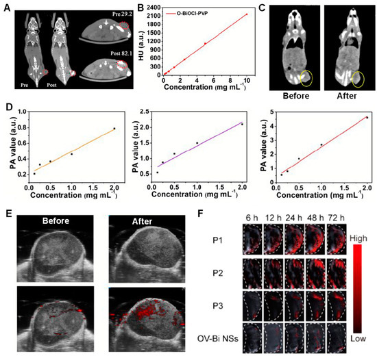 Bismuth-based NM has been used as an ideal X-ray computed tomography (CT) contrast agent due to the higher atomic numbers and X-ray attenuation coefficient of Bi elements [24]. As a typical Bismuth-based NM, BiOX NMs, such as BiOI [70], BiOBr [71], and BiOCl, have recently been used for spatial- and temporal-specific CT imaging of tumors. However, only a few studies on bioimaging of BiOCl NMs have been reported. As reported by Ye’s group [64], Se-doped BiOCl nanosheets were fabricated via a solvothermal method. As shown in the top and cross-sectional views of the mouse (Figure 5A), the evident signal-to-noise ratio changes from 39.24 to 82.12 at 1 h post-injection, meaning the excellent X-ray CT imaging ability of Se-doped BiOCl nanosheets. Multimodal imaging that integrates several imaging technologies, such as fluorescence imaging, magnetic resonance imaging, and photoacoustic (PA) imaging, can diagnose tumors more precisely and quickly. In order to obtain BiOCl NMs with multi-mode diagnostic ability, Zhang’s and Wang’s groups introduced oxygen vacancies into BiOCl NMs. As shown in Figure 5B, with increasing Bi concentrations, significantly enhanced hounsfield unit (HU) values were observed in oxygen-vacancy-rich BiOCl containing aqueous solution. Meanwhile, in vivo CT imaging on tumor-bearing mice showed (Figure 5C) that the HU values on tumors enhanced from 71.6 to 113.3, proving the good CT imaging ability. Moreover, after introducing oxygen defects, PA signals were observed. In order to investigate the relationship between PA signals and oxygen defects, three O-BiOCl nanosheets with different oxygen defects were fabricated. As shown in Figure 5D, with an increasing amount of oxygen defects, PA signals enhanced about 2.0 and 5.5 times, respectively. After intratumoral injection of oxygen-vacancy-rich BiOCl nanosheets into 4T1 tumor-bearing mice, Figure 5E showed that the PA value increased from 0.135 to 0.636, proving the excellent CT and PA imaging ability. In addition, oxygen-vacancy-rich BiOCl s have also been used for PA imaging for Panc-1 tumors through intravenous injection, as shown in Figure 5F [66].