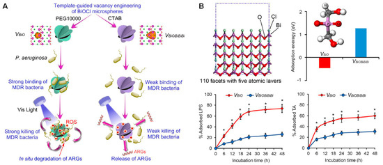 (A) Scheme of vacancy engineering of BiOCl microspheres for binding and killing bacteria; (B) Adsorption ability of the BiOCl microspheres to bacterial cell wall components LPS and TA via first-principles computations and experiments. * indicates significant difference between the two groups at the indicated time point (p < 0.05). Reproduced with permission from Ref. [103], 2021, Elsevier.