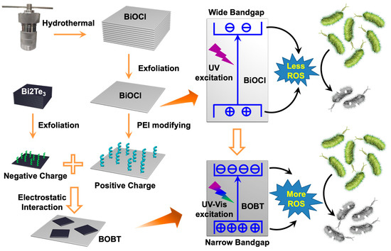 - Chen, R.; Wei, L.; Yan, Y.; Chen, G.; Yang, X.; Liu, Y.; Zhang, M.; Liu, X.; Cheng, Y.; Sun, J.; et al. Bismuth telluride functionalized bismuth oxychloride used for enhancing antibacterial activity and wound healing efficacy with sunlight irradiation. Biomater. Sci. 2022, 10, 467–473. [Google Scholar] [CrossRef]