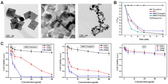BiOCl NMs used for PDT against cancer cells. (A) TEM images of BiOCl nanosheets, nanoplates and P25 nanoparticles; (B,C) photocatalytic degradation of methyl violet (B) and cell-killing (C) abilities of BiOCl nanosheets, nanoplates, and P25 nanoparticles. Reproduced with permission from Ref. [108], 2016, Royal Society of Chemistry.