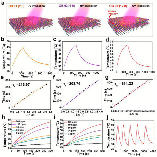 PTT performance of BiOCl induced by oxygen vacancies. Reproduced with permission from Ref. [65], 2020, Royal Society of Chemistry. (a) 3D schematic illustration of BiOCl nanosheets containing different amounts of oxygen vacancies after exposure to UV irradiation for 2, 6 and 12 h. (b–g) Photothermal effect (b–d) and time constant (e–g) of BiOCl nanosheets after the exposure to UV irradiation for 2 (b,e), 6 (h,f), and 12 h (d,g). (h–i) The photothermal-heating curves of BiOCl nanosheets under 808 nm laser irradiation at a power density of 1.5 (h) and 2.0 W cm−2 (i). (j) Recycling-heating profiles of BiOCl nanosheets aqueous solution after 808 nm laser irradiation at 2.0 W cm−2 for five laser on/off cycles.