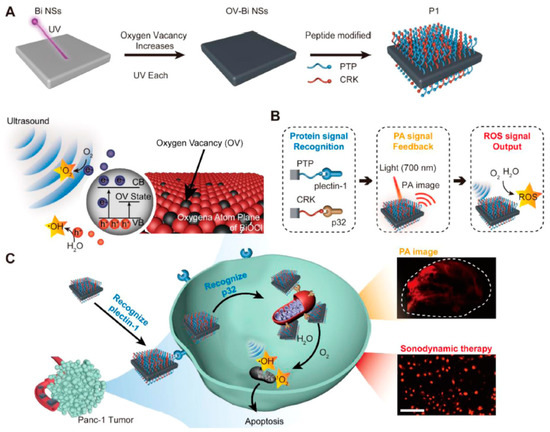 Considering the tissue penetration capability, ultrasound and X-ray are also used for irradiating semiconductors through different mechanisms. With ultrasound irradiation (20 kHz~1 GHz), the microbubbles (cavitation nuclei) existing in the liquid will vibrate, grow, and continuously gather the sound field energy. When the energy reaches the threshold, the cavitation nuclei will collapse and release the energy, producing local high temperature and high pressure (5000 K, 1800 ATM), thus resulting in the decomposition of water molecules and the fracture of chemical bonds. When these broken chemical bonds are recombined, they will release energy and produce luminescence (sonoluminescence). The emitted light is mainly ultraviolet light, which can be used to stimulate most semiconductor materials to generate ROS [115]. Therefore, BiOCl NMs could be excited by ultrasound to produce ROS. Based on this mechanism, Wang et al. [66] designed oxygen-vacancy-rich BiOCl nanosheets modified with PTP and CRK peptides (Figure 11), in which BiOCl served as the sonosensitizer for ROS generation, oxygen vacancies were introduced to enhance ROS generation and induce PA imaging ability, and PTP and CRK peptides were modified to target cancer cells and mitochondria through plectin-1 and p32 proteins, respectively. Electron paramagnetic resonance (EPR) spectrum showed that OV-Bi NSs could produce both 1O2 and OH• under ultrasound irradiation. Moreover, in vitro and in vivo experiments proved that oxygen-vacancy-rich BiOCl NSs modified with PTP and CRK peptides could effectively enter into cancer cells and target mitochondria, thus leading to cell death and tumor elimination, providing a potent nanomedicine for the diagnosis and treatment of pancreatic cancer. GSH, which was highly expressed in tumor tissues, could reduce ROS to protect cancer cells from oxidative stress injury. Therefore, Zhang’s group modified oxygen-vacancy-rich BiOCl NSs with L-buthionine-sulfoximine (BSO), an inhibitor of biosynthesis of GSH, to improve SDT efficacy [69]. With ultrasound irradiation, PEG decorated oxygen-vacancy-rich BiOCl NSs could effectively amplify cellular oxidative stress due to the production of 1O2 and inhibition of GSH. Further in vitro and in vivo experimental results show good SDT efficacy of BSO-modified oxygen-vacancy-rich BiOCl NSs. In addition, the routine analysis of blood, blood biochemistry, biodistribution, and H&E staining of major organs indicated the excellent biocompatibility of BSO-modified oxygen-vacancy-rich BiOCl NSs.