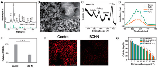 X-ray is another method for stimulating semiconductors to produce ROS, due to its higher energy. This is especially true for bismuth-based semiconductors, as they have stronger X-ray absorption abilities due to high atomic numbers (83) and the X-ray attenuation coefficient (4.3 cm2 g−1 at 100 keV) of Bi elements. In fact, there have been some bismuth-based NMs used for radiation therapy, such as Bi2S3 [116], Bi2Se3 [117], Bi2O3 [118], BiOI [70], pure Bi [119], and BiOCl NMs [120]. However, the radiation therapy efficacy has been limited by the tumor microenvironment of solid tumors, such as hypoxia and antioxidative GSH. In order to improve therapeutic efficacy, Li’s group designed hydrogen peroxide (H2O2)-loaded Cu-doped BiOCl nanocomposites (BCHN) to improve the synergistic effect of radiation and chemodynamic therapy through modulating the tumor microenvironment [120]. BCHN were fabricated through a stepwise method. First, Na0.2Bi0.8O0.35F1.91 (NBOF) was obtained through co-precipitation of sodium nitrate, bismuth nitrate, and ammonium fluoride. Then, Cu2+ was absorbed on the surface of NBOF. After adding sodium hydroxide and H2O2, BCHN monodispersed mesoporous nanospheres were obtained, as proved by the XRD pattern (Figure 12A) and SEM image (Figure 12B). The existence of Cu2+ and H2O2 in BCHN has been confirmed by Cu 2p high-resolution XPS spectrum (Figure 12C) and the redox reaction of potassium permanganate and H2O2 (Figure 12D). Intracellular GSH and O2 levels showed that BCHN could effectively deplete GSH (Figure 12E) and produce O2 (Figure 12F) through Fenton-like reactions among Cu2+, GSH, and H2O2. Therefore, without radiation, BCHN alone could kill some cancer cells due to the chemodynamic property, as well as change the antioxidant and hypoxic microenvironment, while with radiation, BCHN could effectively produce ROS to kill the other cancer cells (Figure 12G). In vivo experiments further proved that BCHN could be used as a synergistic radiation therapy/chemotherapy agent with good biocompatibility.