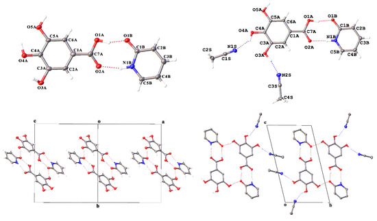 The first two were collected from the same vial at different time periods of the co-crystallization of gallic acid with 2-OH-Py, which resulted in colorless plate-like crystals of 1 on the bottom of the vial and, after some time in the mother liquor, in colorless needle-like crystals of 2 on its walls. Both co-crystals, the previously reported 1 [63] and its new solvatomorph 2 with two molecules of lattice acetonitrile, contain 2-OH-Py as pyridone-2 and gallic acid in a 1:1 ratio (Figure 1, top). The two species are connected by O-H…O and N-H…O hydrogen bonds (O...O 2.563(8) and 2.6062(19) Å, OHO 162.39(15) and 168.73(9)°; N…O 2.941(8) and 2.798(2) Å, NHO 154.7(2) and 175.82(9)°) to produce the expected two-point acid–pyridine heterosynthon [47] (Scheme 1, center). An additional O-H…O hydrogen bond between one hydroxyl group of gallic acid and the oxygen atom of pyridone-2 (O…O 2.640(3) and 2.6772(18) Å, OHO 163.2(4) and 168.58(9)° in 1 and 2, respectively) assembles them into a heterotetramer (Figure 1, bottom). In 2, the latter is decorated by four solvate acetonitrile molecules (Figure 1, bottom right) via O-H…N hydrogen bonds with the other two hydroxyl groups of gallic acid (O…N 2.810(2) and 2.876(2) Å, NHO 146(10) and 170(9)°). In the previously reported co-crystal 1 [63], such heterotetramers form a zigzag-like 3D-framework (Figure 1, bottom left) by O-H…O hydrogen bonds between the acid molecules (O…O 2.763(5)–2.89(1) Å, OHO 130.20(16)–143.06(17)°). In 2, however, they are hold together by parallel-displaced stacking interactions between the aromatic fragments of pyridone-2 and gallic acid with the inter-centroid and shift distances of 3.6319(9) and 1.518(2) Å, respectively, and the angle of 4.30(6)°.