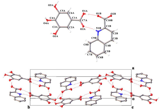 The third co-crystal, 3, was obtained when an equimolar mixture of gallic acid and 2-COOH-quinoline was stored under similar conditions in methanol, as the use of acetonitrile led to the formation of an amorphous powder. The resulting yellow needle-like crystals of the composition [HGA][2-COO-quinolineH] with the molecule of gallic acid and the quinoline zwitterion (Figure 2, top), as identified by X-ray diffraction, feature the same two-point heterosynthon formed by N-H…O and O-H…O hydrogen bonds (O...O 2.6601(18) Å, OHO 172.95(17)°; N...O 2.739(2) Å, NHO 160.73(17)°). The hydroxyl groups of gallic acid bind it to the four neighboring species of 2-COO-quinolineH and gallic acid by using their carboxylate and hydroxyl groups (O...O 2.604(4)–2.9914(19) Å, OHO 144.01(15)–158.29(10)°) to produce hydrogen-bonded double layers that run parallel to the diagonal of the crystallographic plane ac (Figure 2, bottom); those are additionally stabilized by parallel-displaced stacking interactions between the molecules of gallic acid and the quinoline zwitterions with inter-centroid and shift distances of 3.8027(10) and 1.803(2) Å and an angle of 1.63(4)°. The layers are held together by similar stacking interactions with the inter-centroid and shift distances of 3.3893(8) and 0.880(2) Å and an angle of 1.63(4)°.