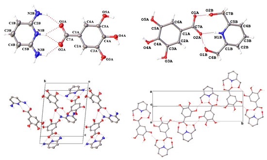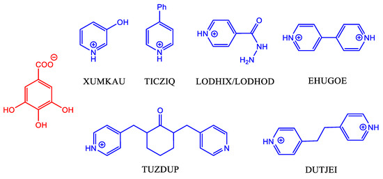 Salts of gallic acid and pyridine-containing compounds and their RefCodes [60,63,64,65,66,86]. X-ray diffraction data for LODHIX and LODHOD are collected from the same salt at 100 K and at room temperature, respectively; LODHIX, LODHOD, EHUGOE, and DUTJEI also contain lattice water molecules.