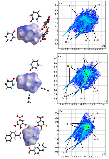 Hirshfeld surfaces (left) of the gallic acid molecule in the co-crystals 1 (top), 2 (center), and 3 (bottom) and their 2D fingerprint plots (right) as generated by Crystal Explorer [83]. Hereinafter, on the Hirshfeld surfaces (left), the red, white, and blue color recognizes the interatomic contacts as shorter than, equal to, or longer than the van der Waals interatomic distances, respectively. On fingerprint plots (right), higher and lower concentrations of points corresponding to (di, de) pairs are shown by green and blue areas, respectively; interactions with a total contribution of less than 3% are not designated.