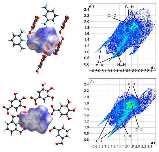Hirshfeld surfaces (left) of the gallate anion in salts 4 (top) and 5 (bottom) and their 2D fingerprint plots (right) as generated by Crystal Explorer [83]. For the second symmetry-independent gallate anion in 4, see Figure S10 of Supplementary Materials.