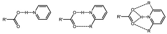 Single- (left), two- (center), and four- (right) point heterosynthons formed by gallic acid and pyridine and its derivatives with proton-donating groups R in the ortho-position.