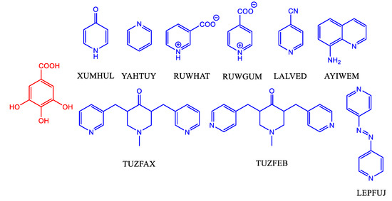 Co-crystals of gallic acid and pyridine-containing compounds and their RefCodes [41,60,62,85]; XUMHUL, RUWHAT, RUWGUM, TUZFAX, and LEFPUJ also contain solvate molecules of water and methanol, respectively.