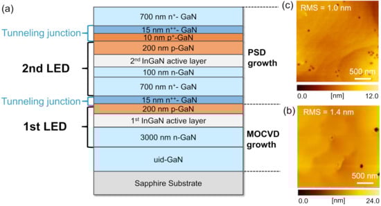 Figure 1a depicts the cross-sectional schematic of a tunneling junction connected InGaN LED stack. The buried LED and top LED structures were named as the 1st and 2nd LED, respectively. Commercially available blue or green InGaN LED wafers were used as the starting materials, which were generated using a typical MOCVD process. In Figure 1b, hexagonal V-shaped pits can be found on the starting surface of p-type GaN wafers generated by MOCVD. The PSD was used to perform epitaxial growth in an Ar/N2 environment. The pulsed sputtering sources were operated at the discharged power ranging from 80 to 250 W. The growth rate of GaN was typically 0.5–1.5 μm/h. Growth temperature ranged from 500 °C to 700 °C. The epitaxial process started with the growth of a 15 nm-thick n++-GaN layer ([Si] = 2 × 1020 cm−3) and a 700 nm-thick n+-GaN layer ([Si] = 8 × 1019 cm−3) on the LED wafers. Sequentially, the 2nd LED structure was grown: 100 nm-thick n-GaN, 30 nm-thick InGaN active layer, 200-nm-thick p-GaN ([Mg]~3 × 1019 cm−3), and 10 nm-thick p+-GaN ([Mg]~1 × 1020 cm−3). The 2nd InGaN active layer consisted of a multiple quantum well structure with the In composition in the InGaN well of ca. 15%. A typical hole concentration of p-GaN grown under similar growth conditions was determined to be 1–2 × 1017 cm−3 from Hall effect measurements. Finally, the 2nd LED structure was capped with a 15 nm-thick n++-GaN layer ([Si] = 2 × 1020 cm−3) and a 700 nm-thick n+-GaN layer ([Si] = 8 × 1019 cm−3). The [Si] and [Mg] were controlled by changing the vapor fluxes from the solid-state pulsed sputtering sources. We also note that after the epitaxial process, no p-type activation annealing was performed. After the epitaxial process, the top surface of the tunneling junction of the second LED was atomically flat with a root mean square surface roughness of 1.0 nm as shown in Figure 1c. PSD-grown n+-GaN showed a relatively smoother surface morphology even with the high [Si] close to 1020 cm−3 compared to the case of MOCVD.