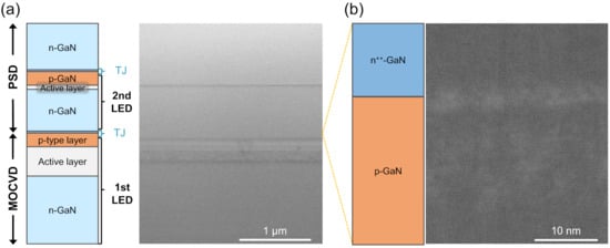 The microscopic structure of the tunneling junction connected InGaN LED stack is shown in cross-sectional transmission electron microscopy (TEM) (HD2700, Hitachi, Japan) images in Figure 2a,b. The Z-contrast image in Figure 2a confirmed the InGaN active layers in each LED as dark lines. Their interfaces remained abrupt after the epitaxial process, indicating negligible thermal damage to the InGaN active layers thanks to the low growth temperature of PSD. A low thermal budget epitaxial process is essential for integrating green or longer wavelength InGaN LEDs. The tunneling junction did not provide any contrast in Figure 2a. Even though the regrowth interface was not clearly visible in the high-resolution TEM image in Figure 2b, no additional structural defects, such as threading dislocations or stacking faults, were formed between the p-type GaN and n++-GaN layers.