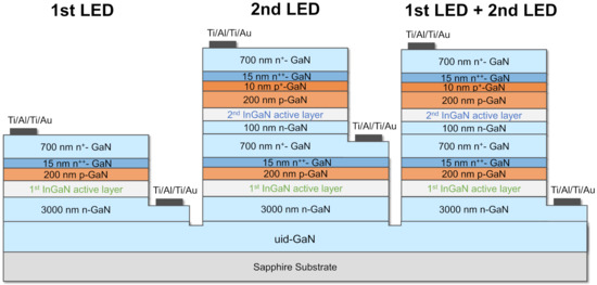 Conventional photolithography defined the LED mesa and ohmic electrode patterns. The dry etching was performed using an ICP-RIE plasma etching system (RIE-101PHi, Samco inc., Kyoto, Japan) with the ICP and RF power of 80 and 30 W, yielding the etching rate of 80 nm/min for GaN. The etching rate determined the ething depth for the formation of anode and cathode electrodes and device isolation. The n-type and p-type ohmic contacts were Ti/Al/Ti/Au (20/40/20/40 nm) and Pd/Au (50/50 nm) metal stacks, respectively. Using UHV e-beam deposition equipment, all electrode metals were deposited. Figure 4 shows the monolithic integration of dual-color LEDs in cross-section.