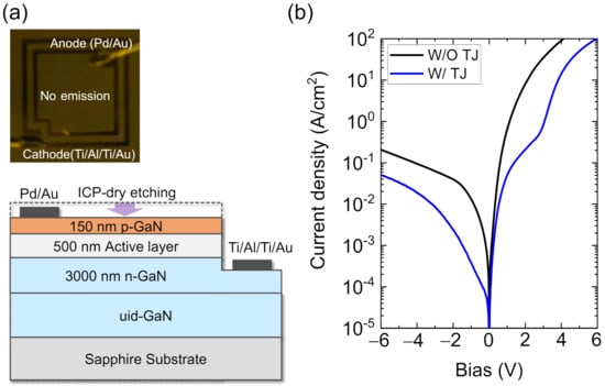 (a) A cross-sectional schematic and optical microscope image of the p-type GaN surface etched LED (reference). (b) Current density–voltage characteristics of the reference LED and tunneling junction (TJ) contact LED.