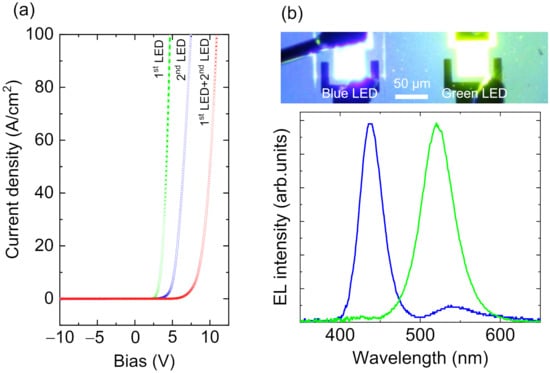 Figure 6a summarizes the current-voltage characteristics of the monolithically integrated 1st LED, 2nd LED, and 1st LED + 2nd LED, respectively. In Figure 6a, the LED mesa size was 90 × 90 μm2. The LED devices all have distinct rectifying properties. The forward voltage of the buried 1st LED was 3.71 V at 20 A/cm2. The voltage penalty across the tunneling junction was well suppressed, and less than 1 V, while state-of-the-art InGaN LEDs with ITO contacts operate at roughly 3 V forward voltage. This is attributed to the high Mg and Si doping levels with the abrupt doping profile in the tunneling junction. The 2nd LED yielded a relatively higher forward voltage of 5.67 V at 20 A/cm2. We believe that the high forward voltage can be explained by the high sheet resistance of the bottom n+-GaN.We need further optimization in the film thickness and doping profiles. The 1st LED + 2nd LED yielded a reasonable forward voltage of 9.05 V at 20 A/cm2, almost equal to the sum of the forward voltages of the 1st LED and 2nd LED. The EL spectra and optical microscope image of blue and green LEDs on the same wafer with a 50 μm squared emission area are shown in Figure 6b. The uniform blue and green emissions were observed, and their light intensities can be controlled separately. The full width at half maximum values were 33 and 45 nm for blue and green emissions in Figure 6b. The buried 1st LED worked well without significant damage even after ICP-dry etching. Additionally, the low-temperature PSD approach may be preferable for creating high In composition red emission InGaN LEDs, as it has already demonstrated high brightness InGaN LEDs with a 633 nm emission wavelength [12]. Thus, the PSD technique will be quite attractive for the sequential growth of the RGB InGaN LED stack with the tunneling junction. This clearly indicates the feasibility of the high-density monolithic integration of RGB micro-LEDs using standard photolithography and the ICP-dry etching process.