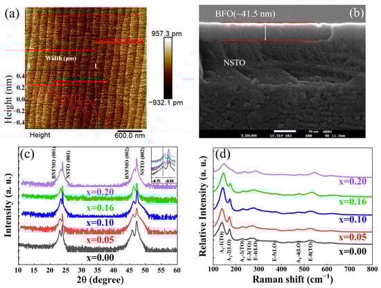 (a) Etched topography of NSTO substrate. (b) Microscopic SEM cross-sectional image of a Bi0.84Nd0.16Fe0.99Mn0.01O3 thin film on a NSTO substrate. (c) 2θ-XRD patterns of Bi1−xNdxFe0.99Mn0.01O3/NSTO heterojunctions (x = 0.00~0.20). (d) Raman spectra for BNFMO films at room temperature.