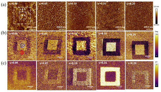 As shown in Figure 2b,c, we adopted piezoresponse force microscopy (PFM) to obtain the local ferroelectric properties of the BNFMO films. The acquired PFM out-of-plane phase and amplitude images were acquired after applying −8 and +8 V biases on the surface of the BNFMO films. Based on the PFM results, the polarization reversal becomes more apparent when the doping amount of Nd ion increases from 0 to 16%, which is ascribed to the enhanced ion or electron displacement polarization caused by Nd ions [16]. When the doping amount of Nd ion reached 20%, the contrast of the phase and amplitude out of the plane became lower which is due to the formation of the orthorhombic structure of the film. The results are consistent with the Raman spectrum.