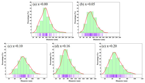 Histograms for particle size distribution and Gaussian fitting curve of (a–e) BNFMO (x = 0.00, 0.05, 0.10, 0.16, 0.20) films.